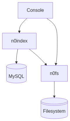 コンポーネントは、主にファイルシステムをHTTP経由でアクセスできるようにするn0fsと、MySQLベースでファイルに対してメタデータを付与するn0indexに分かれます。 概要図は以下のようになります。
