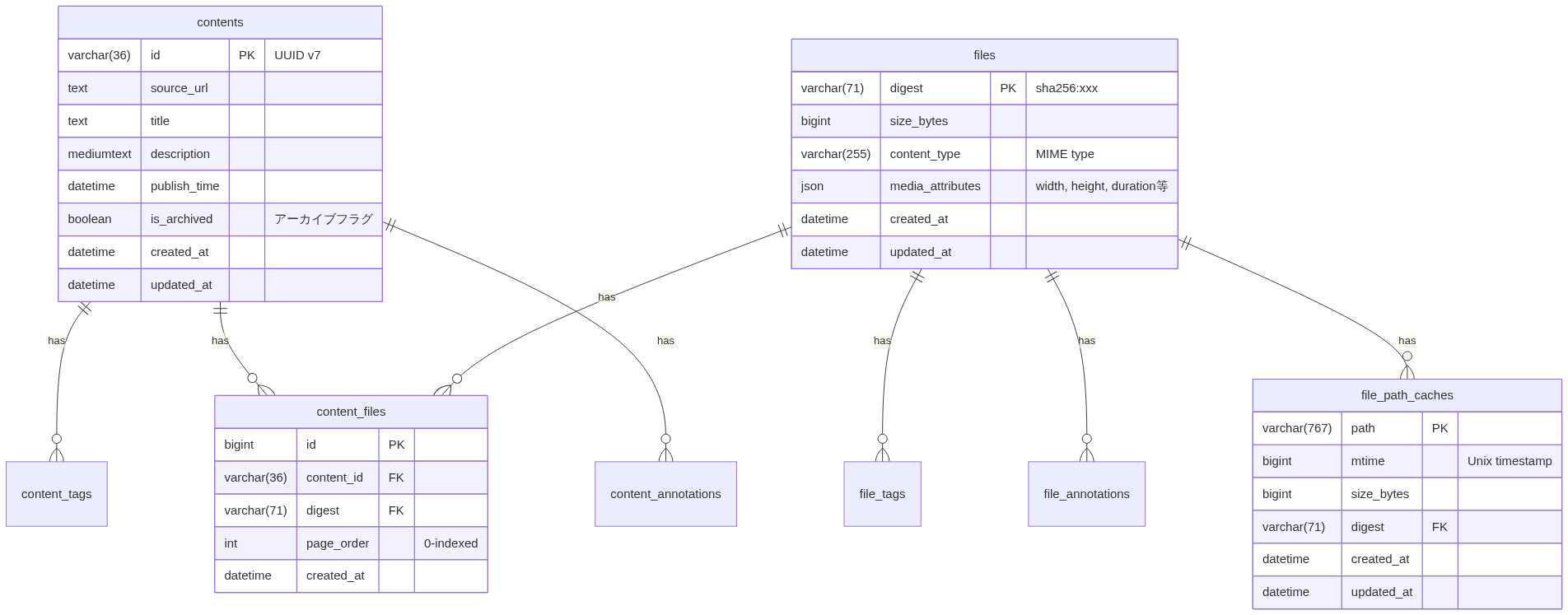 n0index は n0fs をベースにコンテンツとしてのアクセス性を上げるために、MySQLにメタデータを保存して拡張します。 MySQLのER図は以下のような形になります。